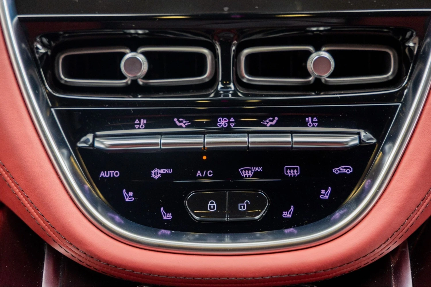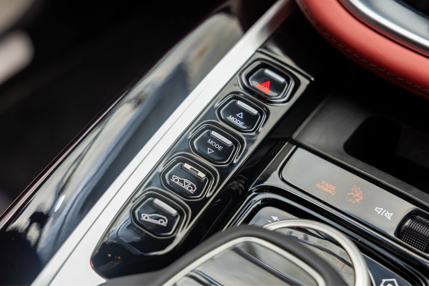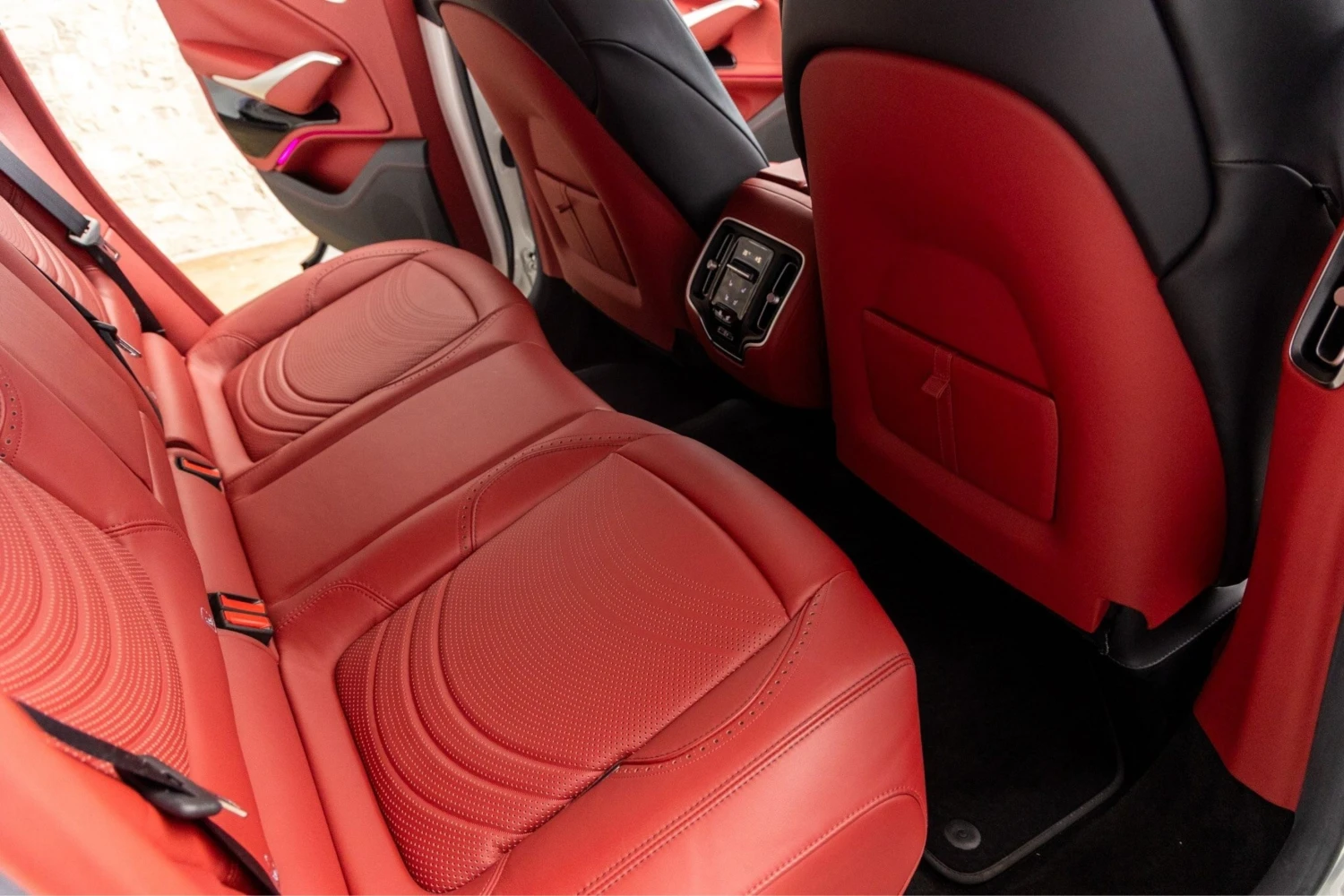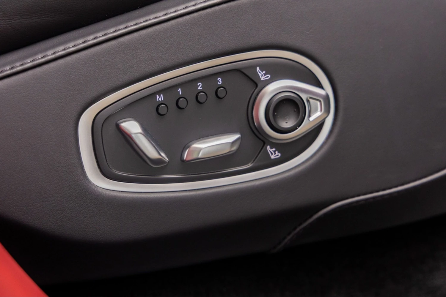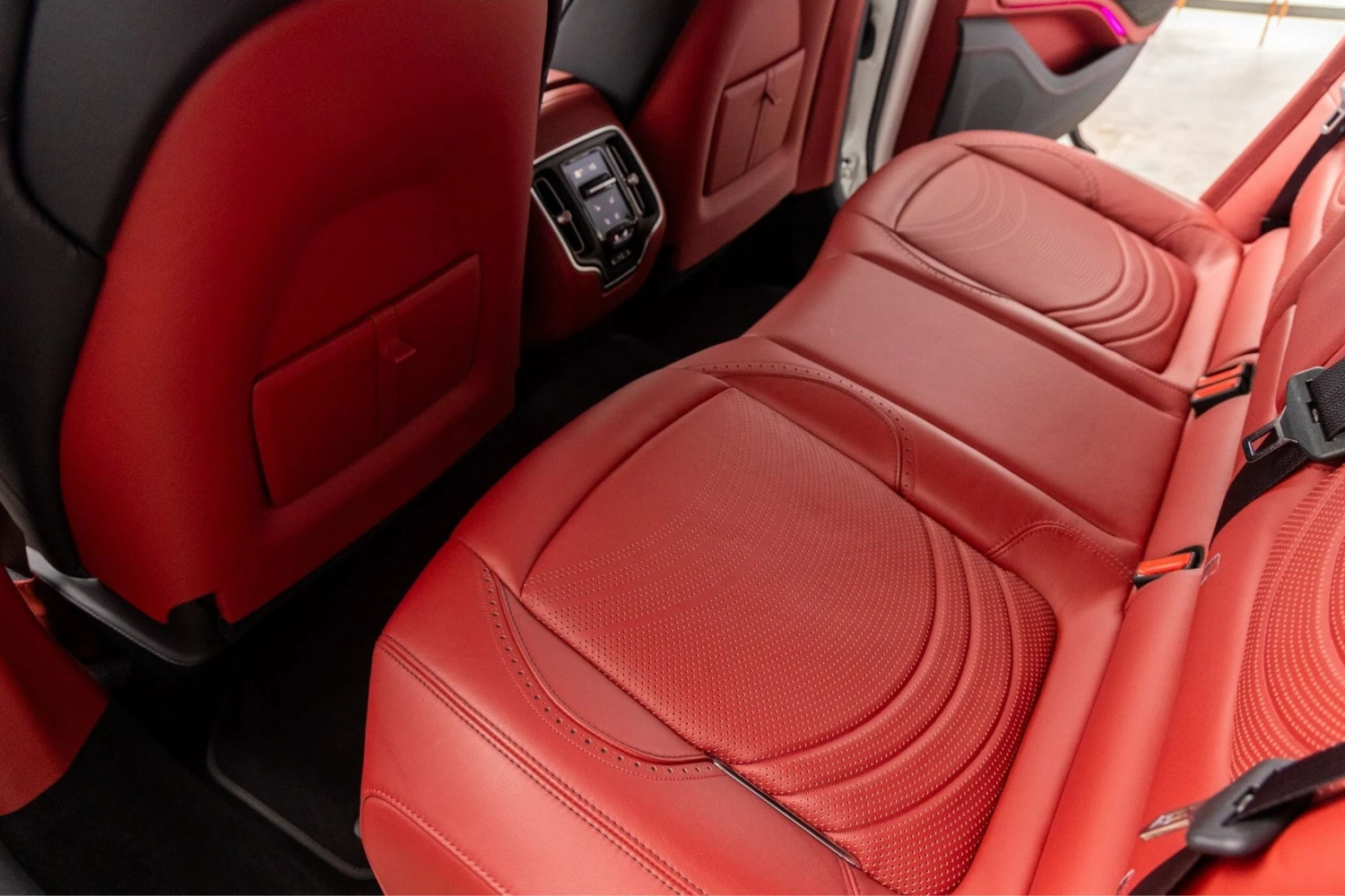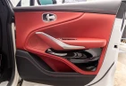 The interior features a red leather duo-tone finish and accommodates 5 people. The cabin offers a comfortable environment suitable for both driver and passengers.