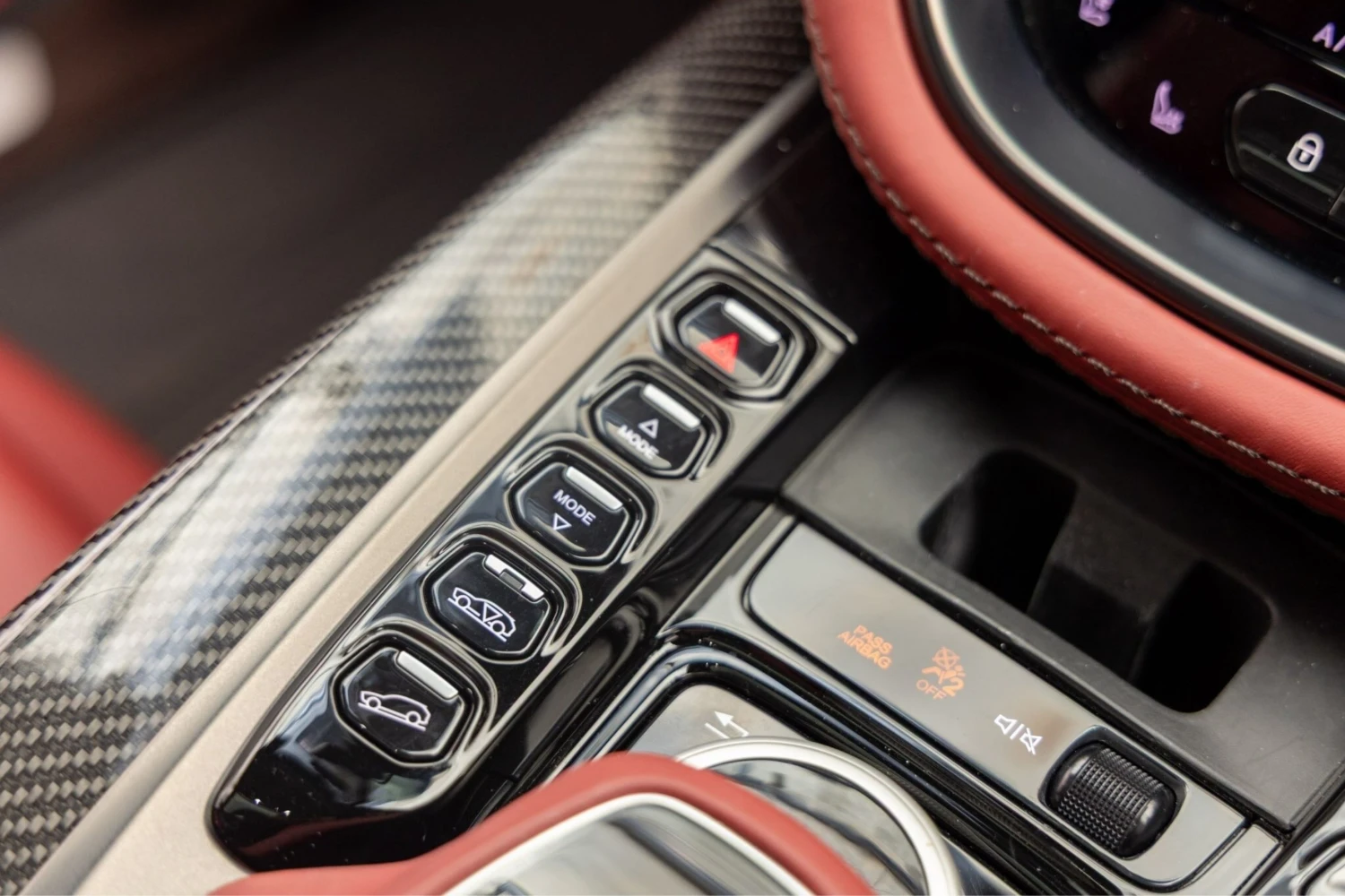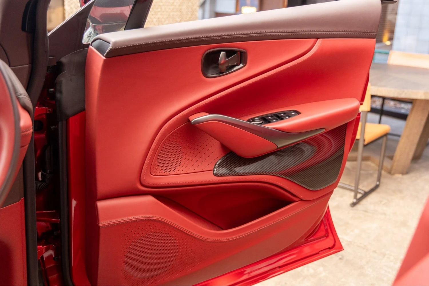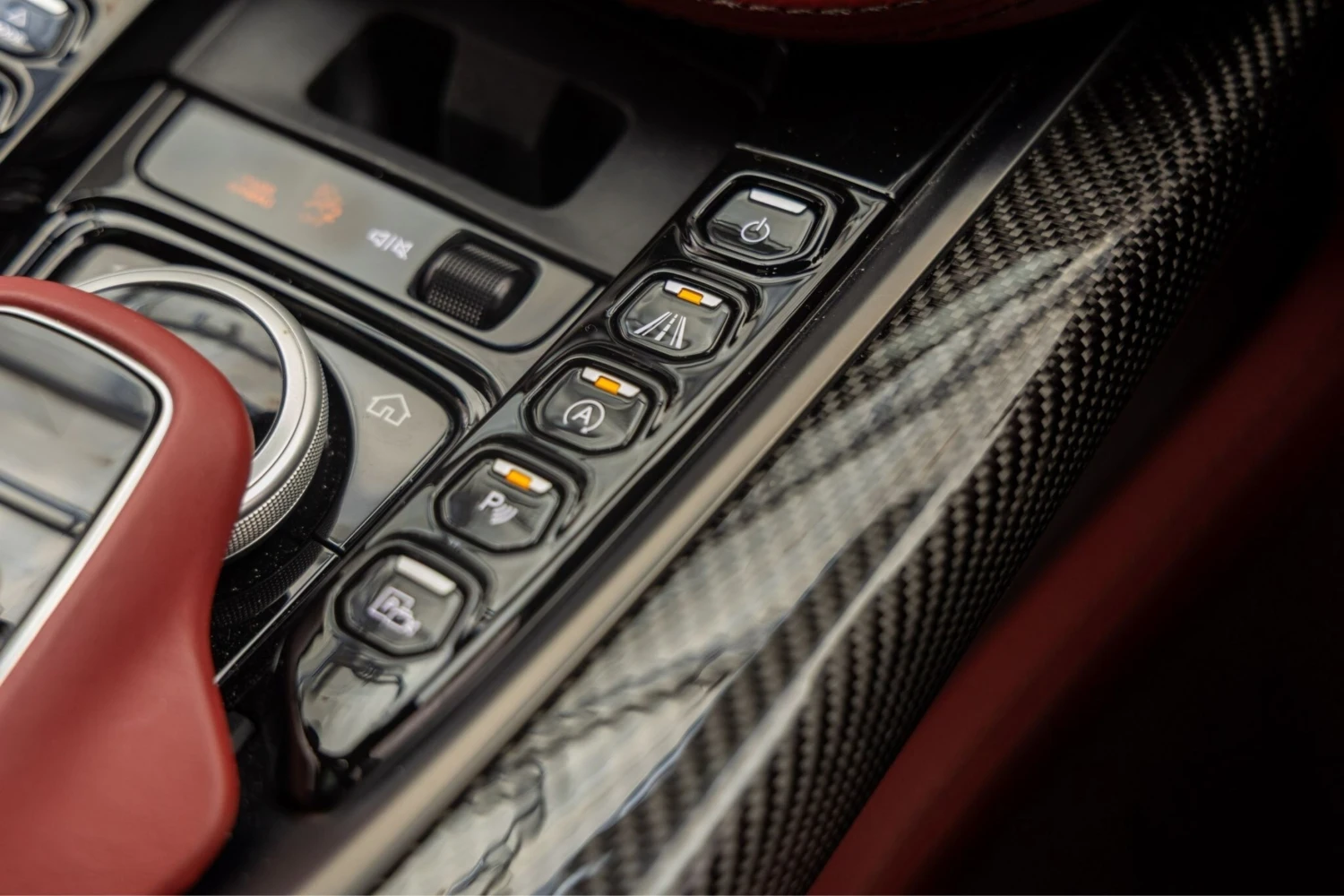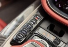 The cabin accommodates five occupants and is trimmed in Duotone Leather (Red/Brown) with a leather roof liner and carbon interior accents. Comfort features include Heated & Ventilated Seats, Seat air conditioning, Seat heater, Electric seat adjustment, bench seating arrangement where specified, TV: Full-segment, Display audio with Apple CarPlay/Android Auto compatibility, Car navigation system (HDD) and a dashcam. Convenience items include Keyless access, Smart key, Power windows and an audio system with music player connectivity.