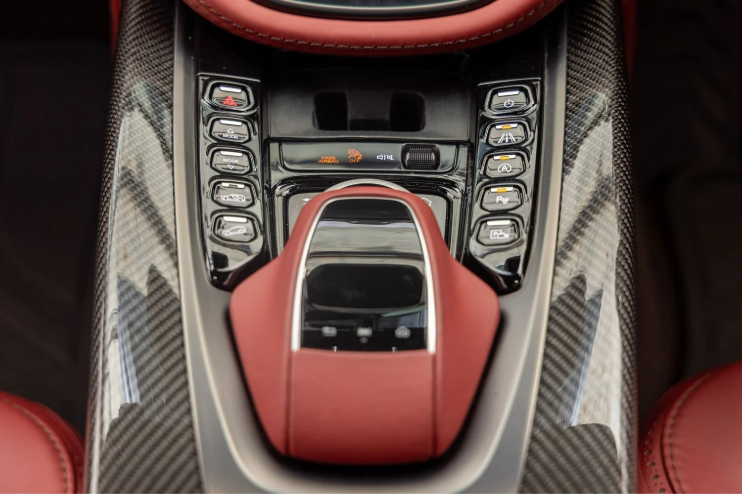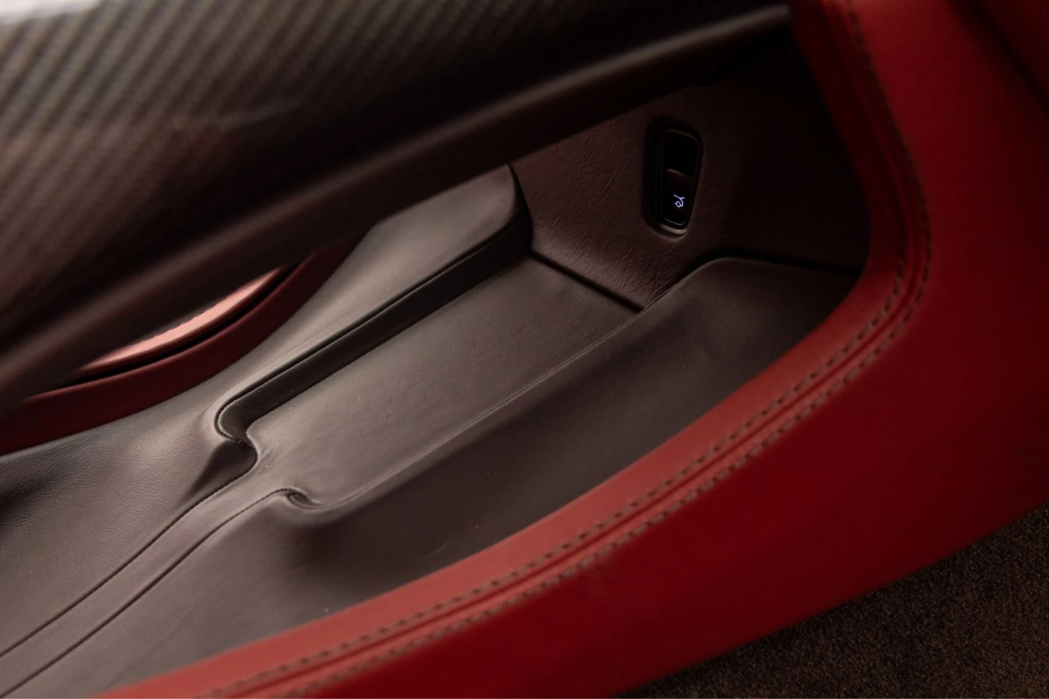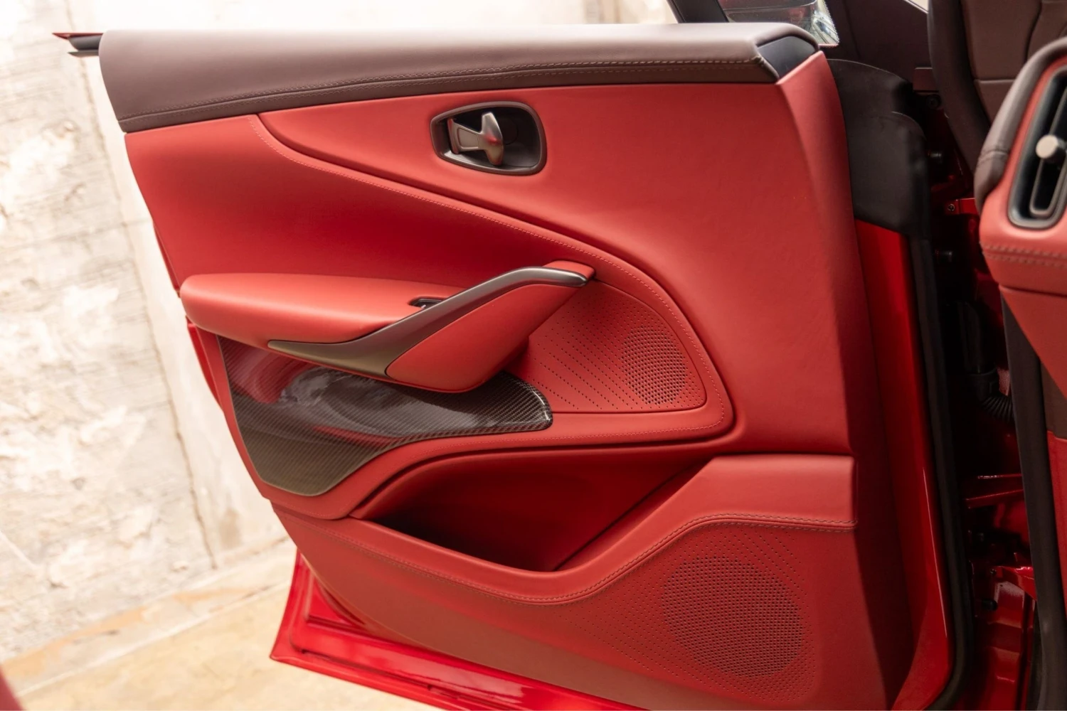 The cabin accommodates five occupants and is trimmed in Duotone Leather (Red/Brown) with a leather roof liner and carbon interior accents. Comfort features include Heated & Ventilated Seats, Seat air conditioning, Seat heater, Electric seat adjustment, bench seating arrangement where specified, TV: Full-segment, Display audio with Apple CarPlay/Android Auto compatibility, Car navigation system (HDD) and a dashcam. Convenience items include Keyless access, Smart key, Power windows and an audio system with music player connectivity.