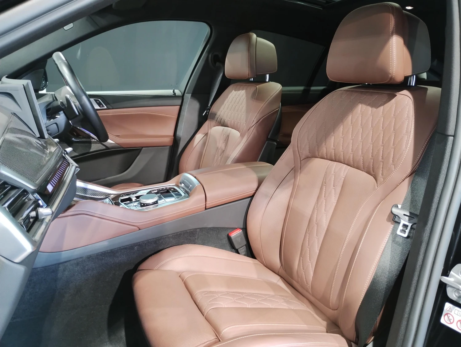 Luxury Sports SUV / Cross-country, 4WD (xDrive), 4.4L (4400cc) V8 Hybrid gasoline engine, 8-speed automatic transmission (8AT with manual mode), Right-hand drive, 5 seats, 5 doors, Black Sapphire Metallic, M Sport Package, M Carbon Fiber mirrors, M Carbon Fiber interior trim, Full aero package, Adaptive LED headlights, Adaptive cruise control (ACC), Lane Keep Assist, Collision mitigation braking, Blind Spot Monitor / Rear Traffic Alert, Parking Assist, All-around (360°) camera, Front/Rear cameras, Obstacle sensors, ABS, Power steering, Anti-skid system, Hill Descent Control, Automatic high beam, Glass sunroof, Genuine coffee brown leather seats, Electric seats, Heated seats, Dual-zone climate control, Head-Up Display, HDD navigation system, Display Audio (Apple CarPlay / Android Auto), ETC, Aluminum wheels (2022 design), Smart key & keyless entry, Power windows