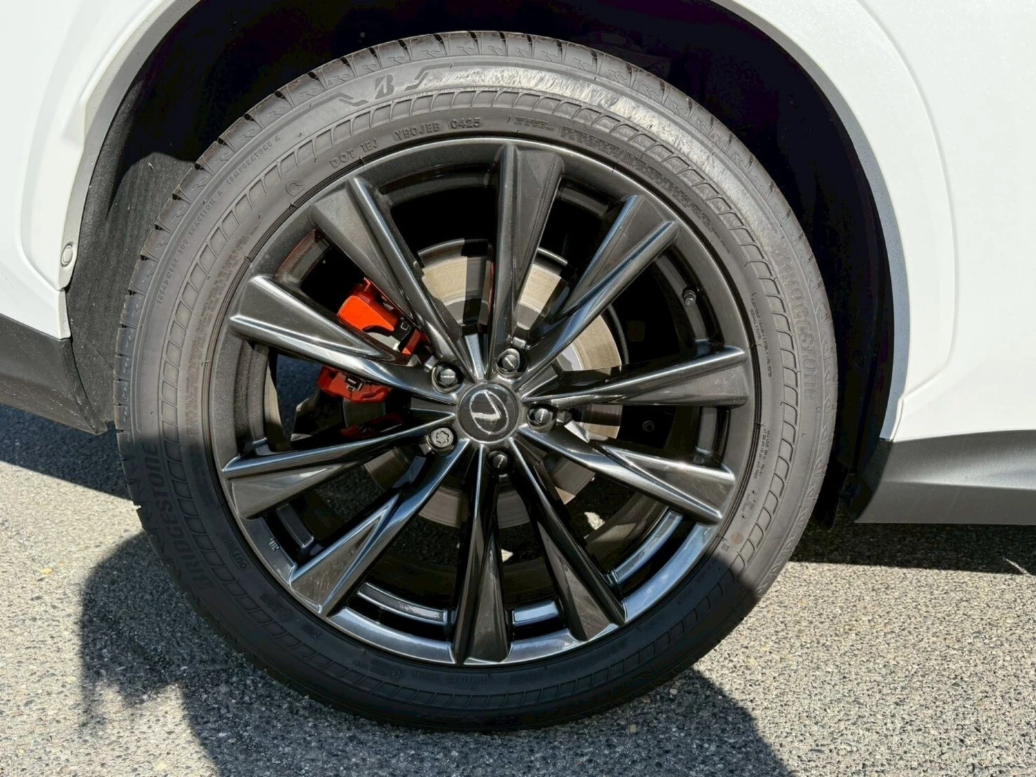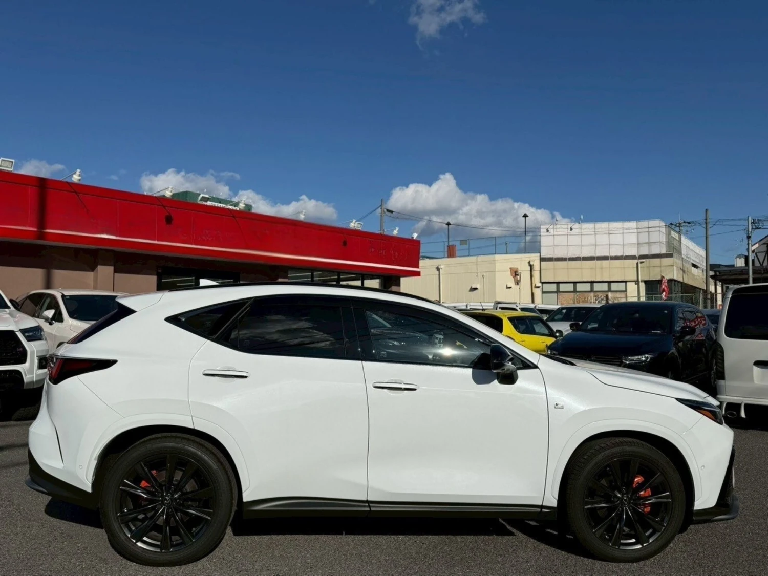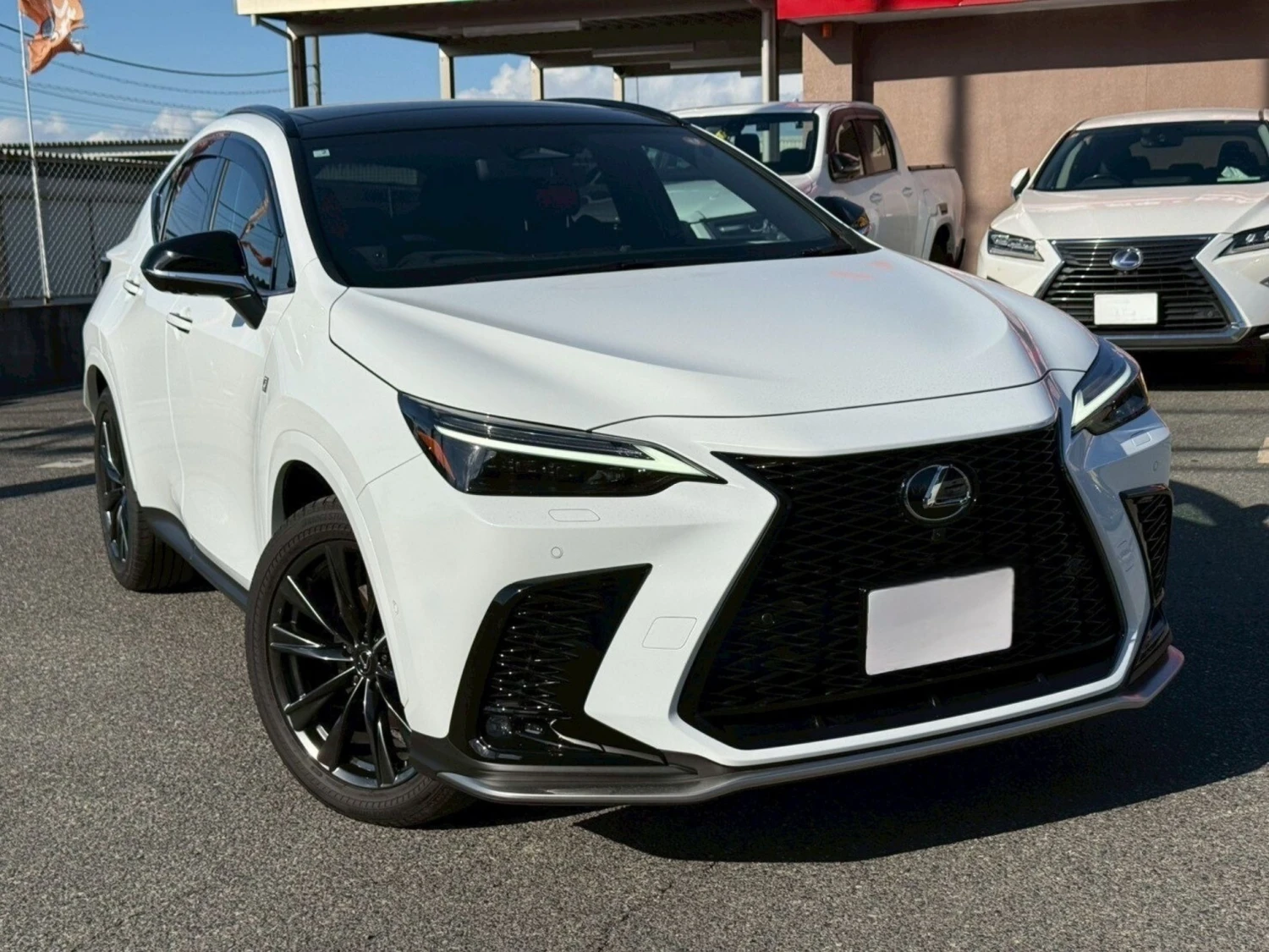 The exterior in White Nova Glass Flakes highlights the bold SUV design. LED headlights, aluminum wheels, roof rails, and sporty F Sport accents emphasize its dynamic character.