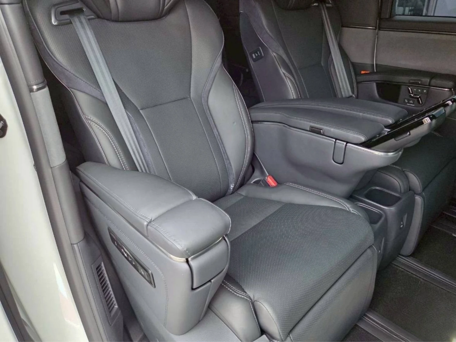 The spacious 6-seat cabin is designed for premium comfort, featuring ottoman seats, electric adjustment, heated seating, and high-quality materials. The rear entertainment monitor and 14-inch navigation display create a first-class travel experience, complemented by a powerful Mark Levinson audio system and cold weather package.